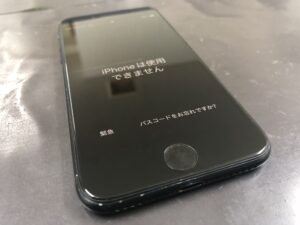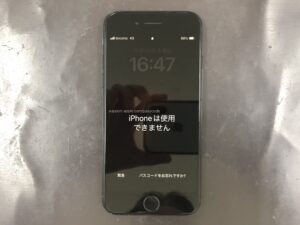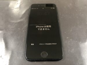 こちらはiPhoneSE第3世代の画面破損で画面が見えない!とお持込み頂きました。この様な症状は通常ですと画面交換修理で改善致します。しかしこのような状態になってから1か月ほどそのままにしておいたようです。そうなると中のデータの消失リスクが高くなってしまいます。理由としては写真にもある様に画面はキレイに直っても「iPhoneは使用できません」という表示になってしまうことがあります。この表示はパスコードを何度も間違えて押してしまうと発生してしまいます。こうなるとロックがかかってしまい、一度iPhone自体を初期化しないと使うことは出来なくなってしまいます。初期化するともちろん中のデータやアプリは全部消えてしまいます。