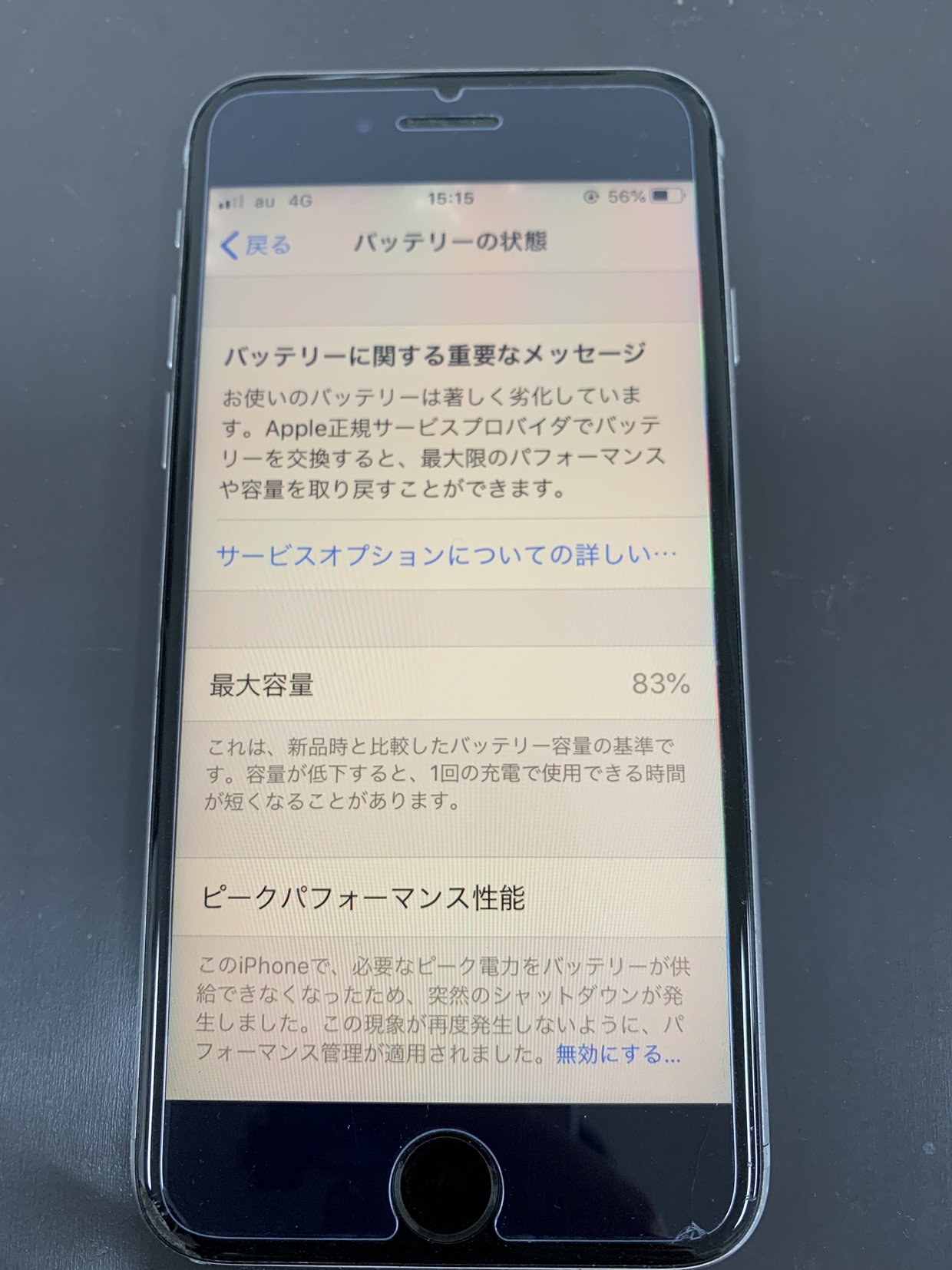 こちらの本体は2年以上お使いの方のiPhoneになり、設定画面で確認ができる最大容量が80%台になっているので劣化しているといえます。